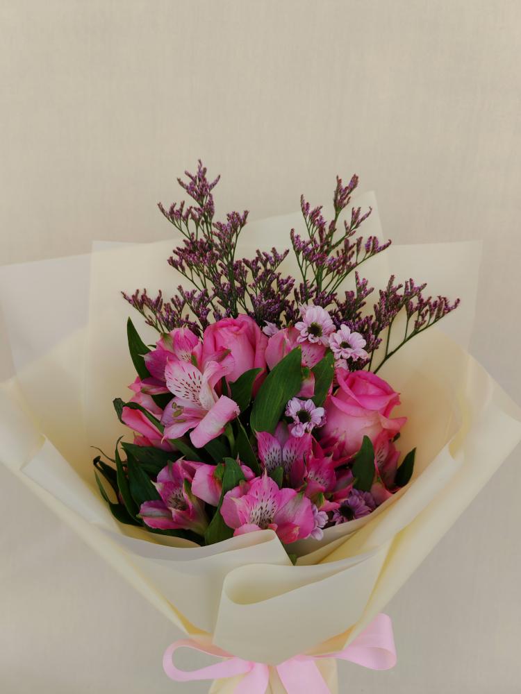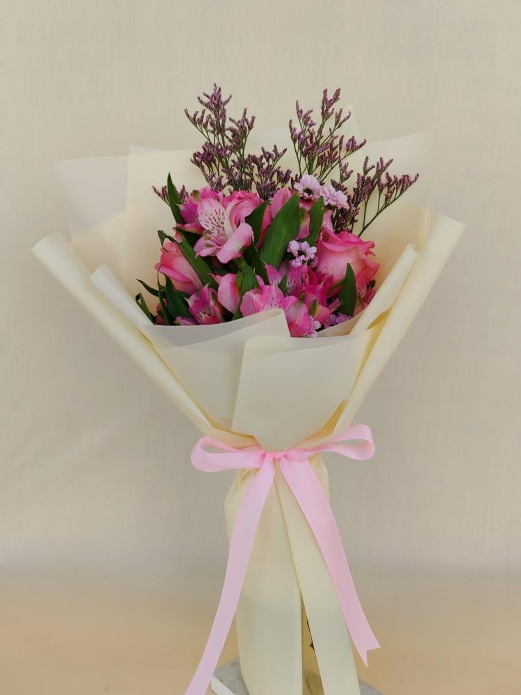اقرأ المزيدبوكيه أستروميريا وردي بتصميم أنيق يجمع بين النعومة والفخامة، يضم زهور الأستروميريا الفريش باللون الوردي مع لمسات بنفسجية ناعمة داخل تغليف كريمي فاخر مزين بشريطة وردية.