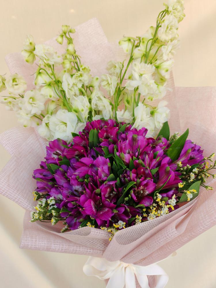 بوكيه فاخر من زهور الألستوميريا الموف الفريش مع لمسات ناعمة من الديلفينيوم الأبيض في تغليف وردي أنيق ومزين بشريطة ساتان بيضاء. تصميم يجمع بين الفخامة والهدوء ويعبّر عن الرقي والجمال الطبيعي بأسلوب ممي...