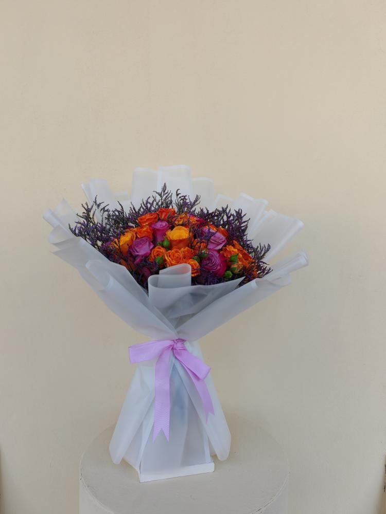 اقرأ المزيدبوكيه فاخر بتنسيق فريد يجمع بين الزهور البرتقالية والبنفسجية في مزيج يعكس الدفء والبهجة.