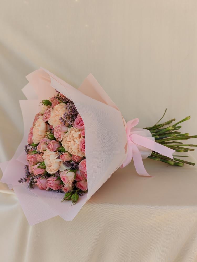 اقرأ المزيدبوكيه فاخر بتصميم أنيق يجمع بين زهور البيبي روز الوردية والكارنيشن الكريمي الفريش مع لمسات بنفسجية ناعمة تضيف لمسة رومانسية حالمة.