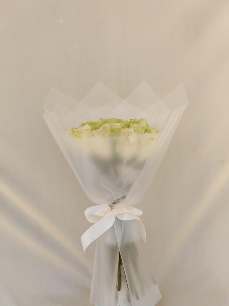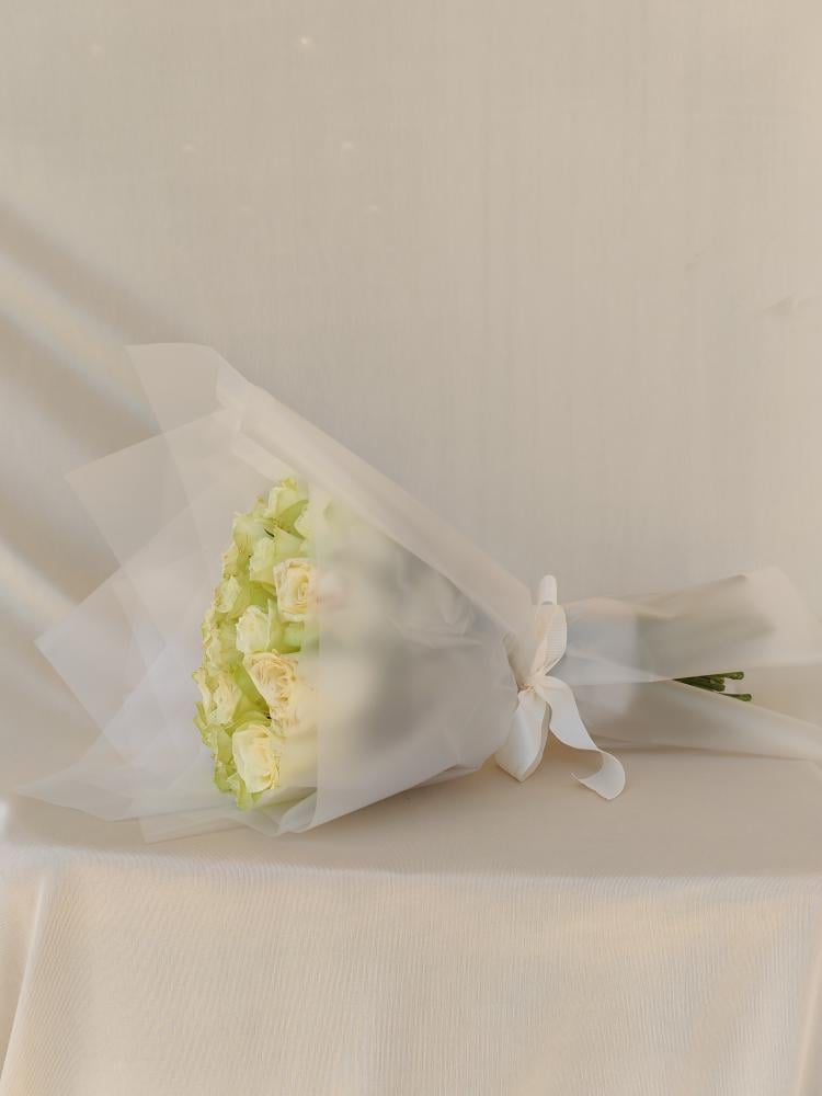 بوكيه أنيق من ورد الجوري الابيض الفريش بتنسيق ناعم داخل تغليف أبيض فاخر ومزين بشريطة ساتان بيضاء.