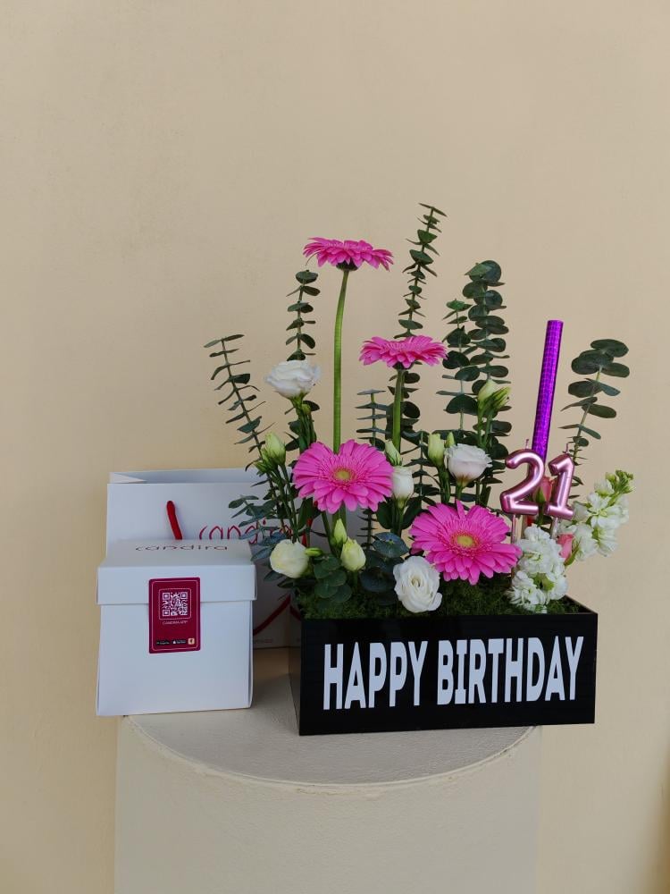 تنسيق وردي فاخر يضم زهورًا طبيعية بتدرجات الوردي ولمسات بيضاء أنيقة، مع كيك صغير من كانديرا وشمعة رقمية تضيف أجواء احتفال فريدة.