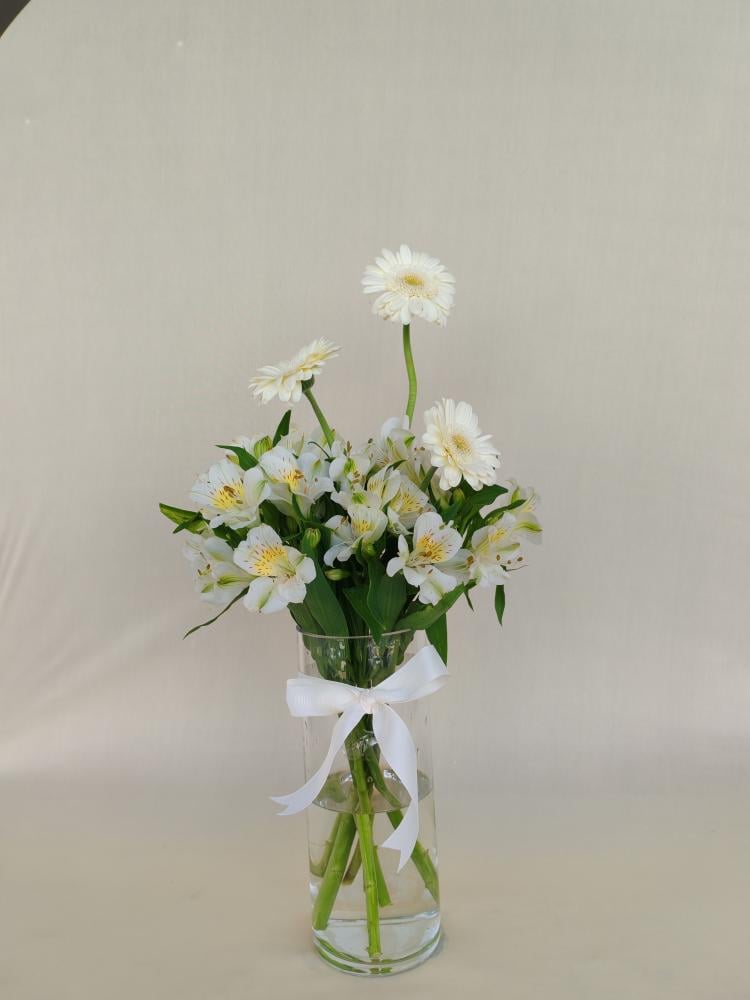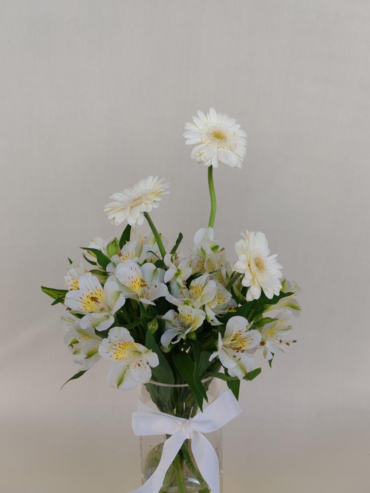 فازة الجربيرا الأبيض بتصميم أنيق يعكس البساطة والفخامة في آنٍ واحد، تضم زهور الجربيرا البيضاء الطبيعية مع الألستروميريا داخل فازة زجاجية طويلة مربوطة بشريطة بيضاء ناعمة.تنسيق راقٍ يعبر عن النقاء والصف...