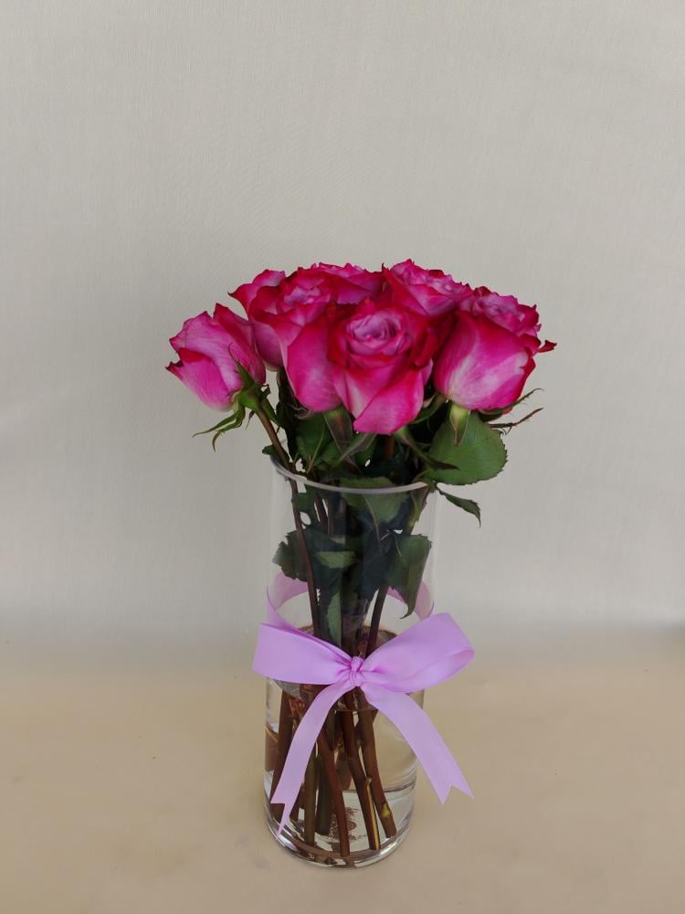 فازة الجوري الموف بتصميم فاخر وألوان ملكية أنيقة، تضم زهور الجوري الموف الفريش داخل فازة زجاجية طويلة مربوطة بشريطة بنفسجية ناعمة. تنسيق راقٍ يعبر عن الفخامة والرومانسية في آنٍ واحد، مثالي كهدية مميزة...