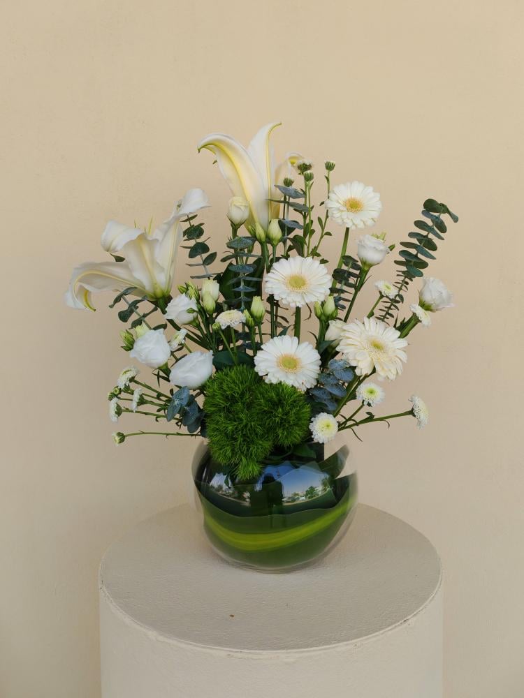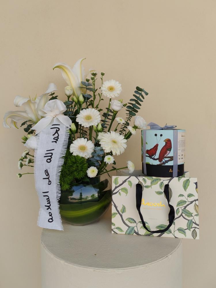 اقرأ المزيدفازة راقية بتنسيق زهور طبيعية بيضاء تحمل عبارة “الحمد لله على السلامة”، مرفقة مع شوكولاتة أنوش الفاخرة بتغليف أنيق.