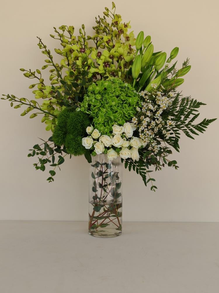 تضم توليفة راقية من أوركيد أخضر، هايدرانجيا، ورد أبيض، وزهور واكس عطرية، مع لمسة من الأوراق الخضراء الطبيعية التي تضفي إحساسًا بالانتعاش والحياة.