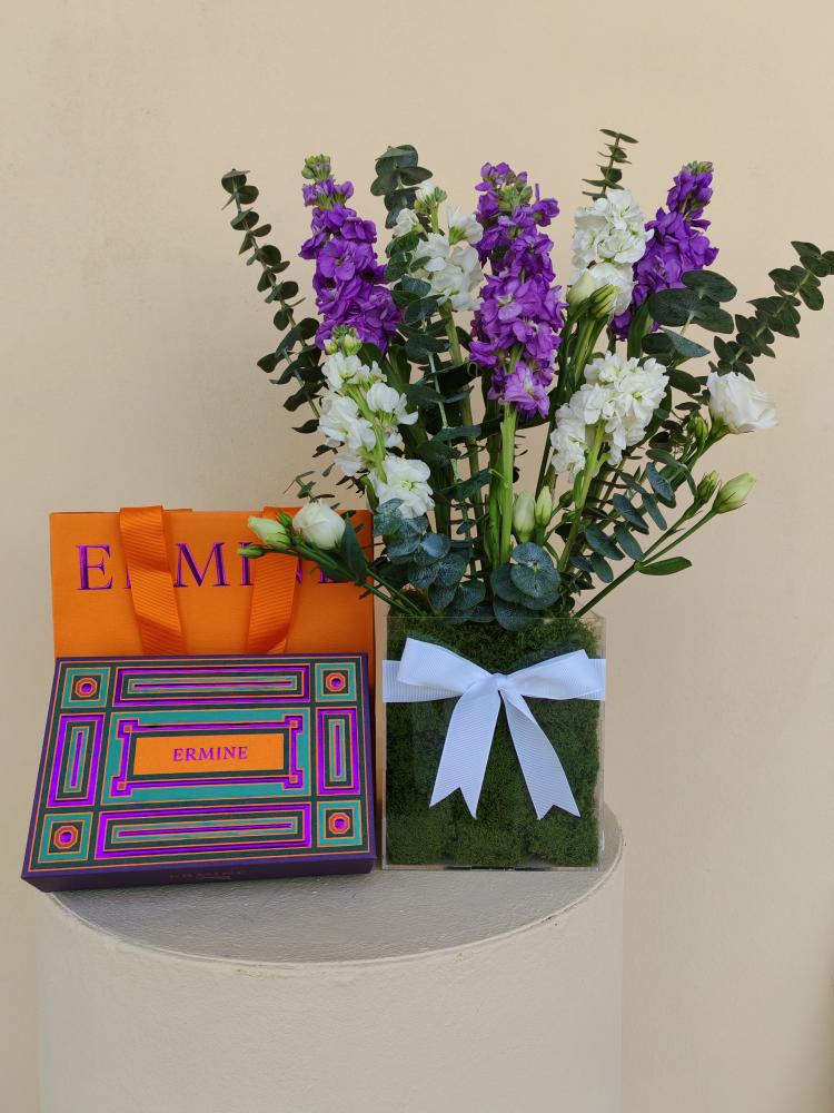 فازة أنيقة من الزهور الطبيعية بتدرجات البنفسجي والأبيض مع شريطة سماوية ناعمة، تأتي مع شوكولاتة إيرماين الفاخرة بتغليف أنيق يجسد الفخامة والذوق الرفيع. هدية مثالية تعبّر عن الرقي في كل مناسبة، سواء للت...