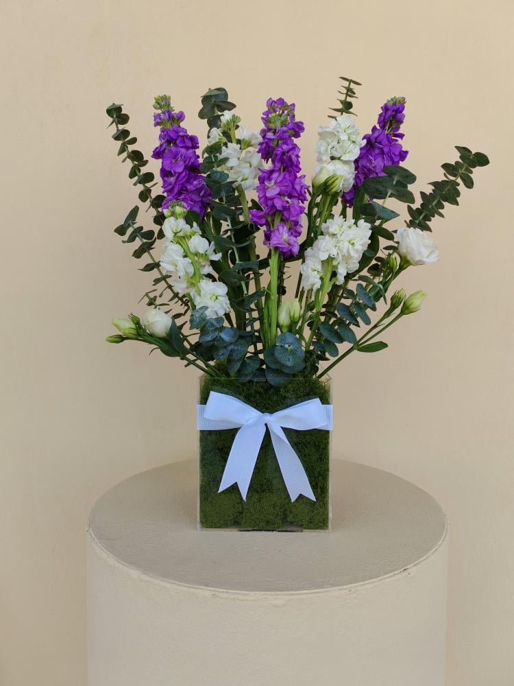 فازة أنيقة بتنسيق فاخر من الزهور الطبيعية بتدرجات البنفسجي والأبيض، مصممة بعناية داخل قاعدة زجاجية مزينة بشريطة سماوية ناعمة. تعبّر عن الهدوء والجمال في أبهى صوره، لتكون هدية مثالية للمنازل والمكاتب أ...