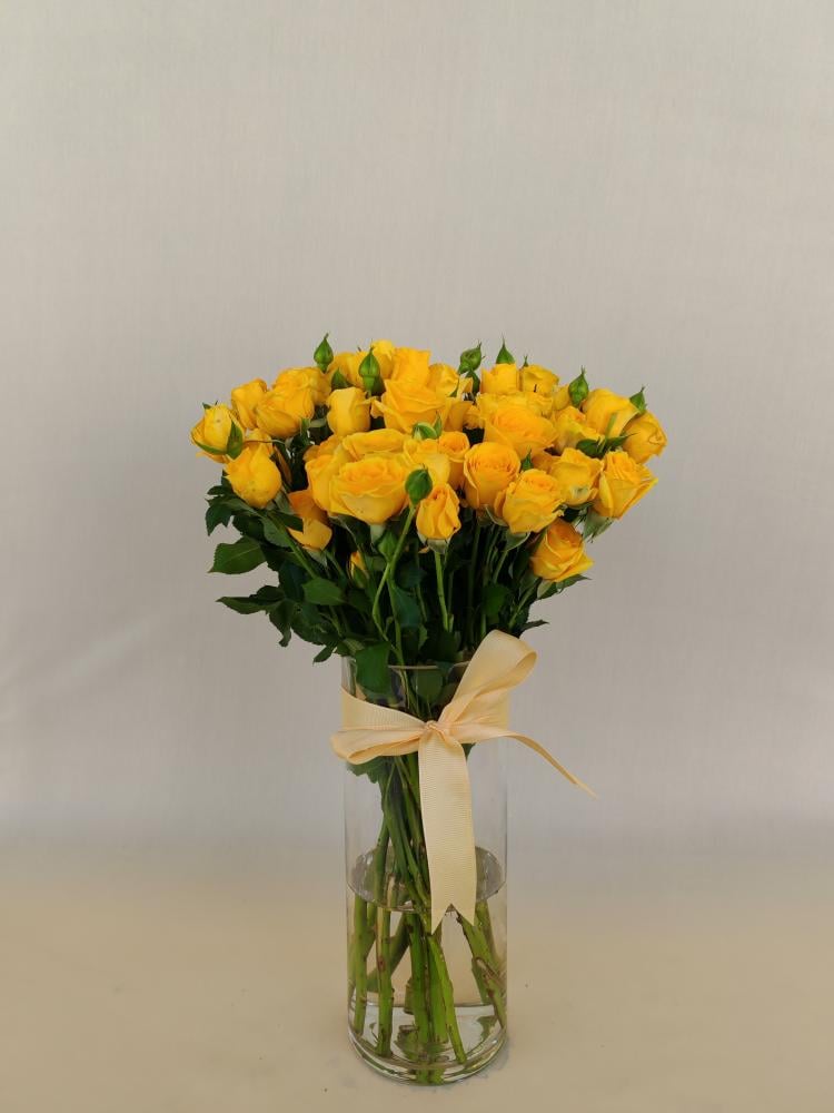فازة بيبي روز أصفر بتصميم أنيق ينبض بالحيوية والتفاؤل، تضم باقة من زهور البيبي روز الفريش باللون الأصفر داخل فازة زجاجية طويلة مربوطة بشريطة كريمية ناعمة.تنسيق مشرق يعبر عن البهجة والطاقة الإيجابية، م...