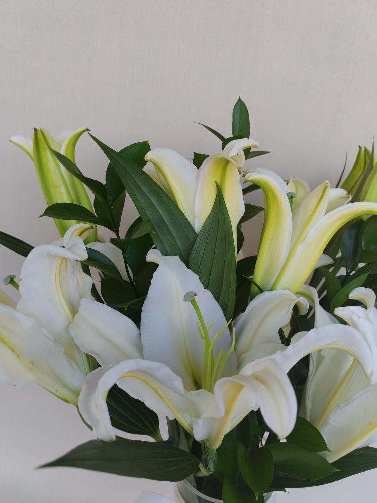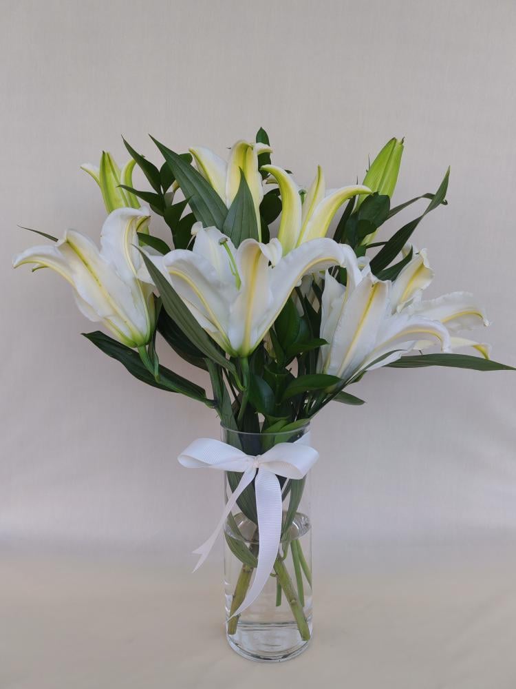اقرأ المزيدفازة فاخرة تحتوي على زهور الكازابلانكا البيضاء الفريش بتغليف بسيط وشريطة ساتان بيضاء تضيف لمسة من الأناقة الراقية.