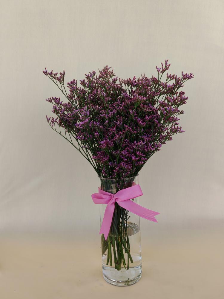 تضم زهور الليمونيوم الفريش باللون الموف داخل فازة زجاجية طويلة مربوطة بشريطة وردية ناعمة، لتضفي لمسة من الرقي والجمال على أي مكان.