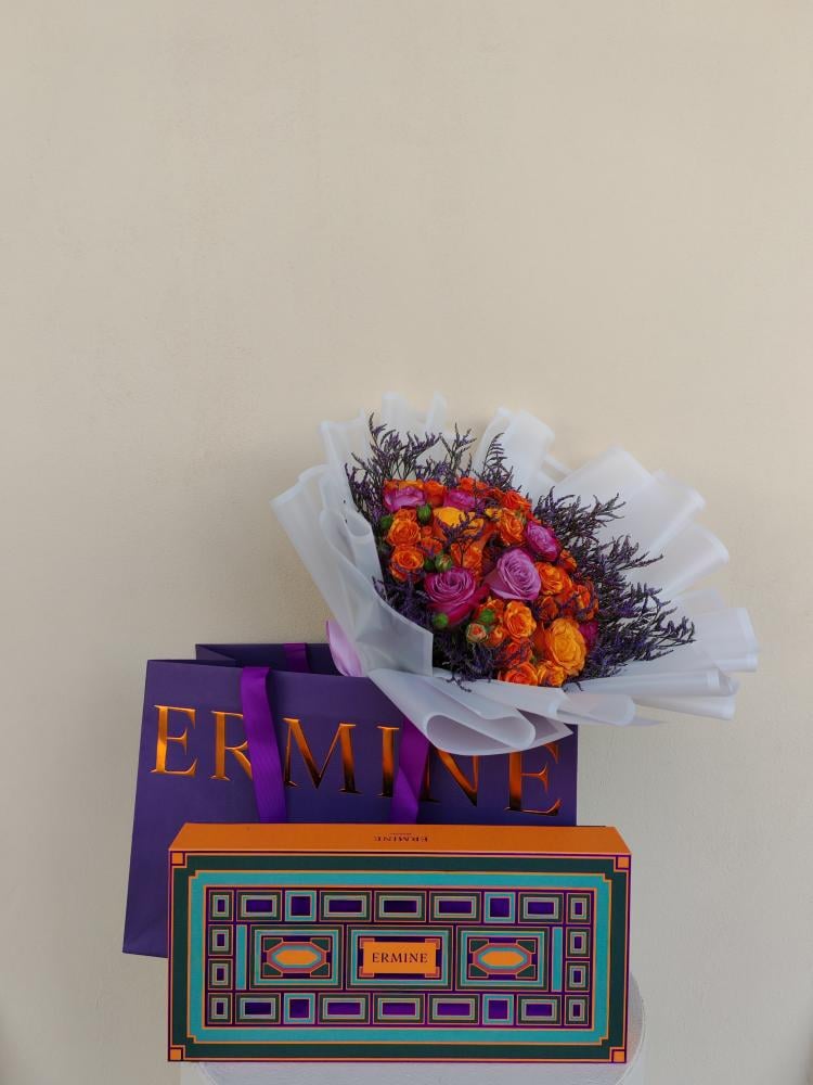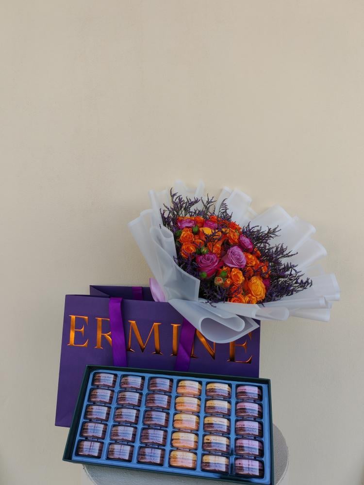 اقرأ المزيدوكيه فاخر من تنسيق زهور ملونة بتدرجات البنفسجي والبرتقالي مع لمسة من الجمال الطبيعي، مرفق بعلبة شوكولاتة إيرماين الفاخرة بتغليف أنيق يجسد معنى الذوق والرقي.