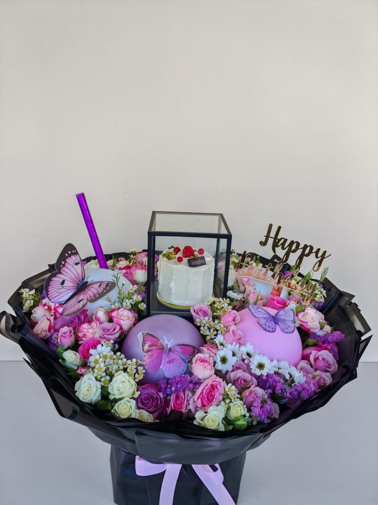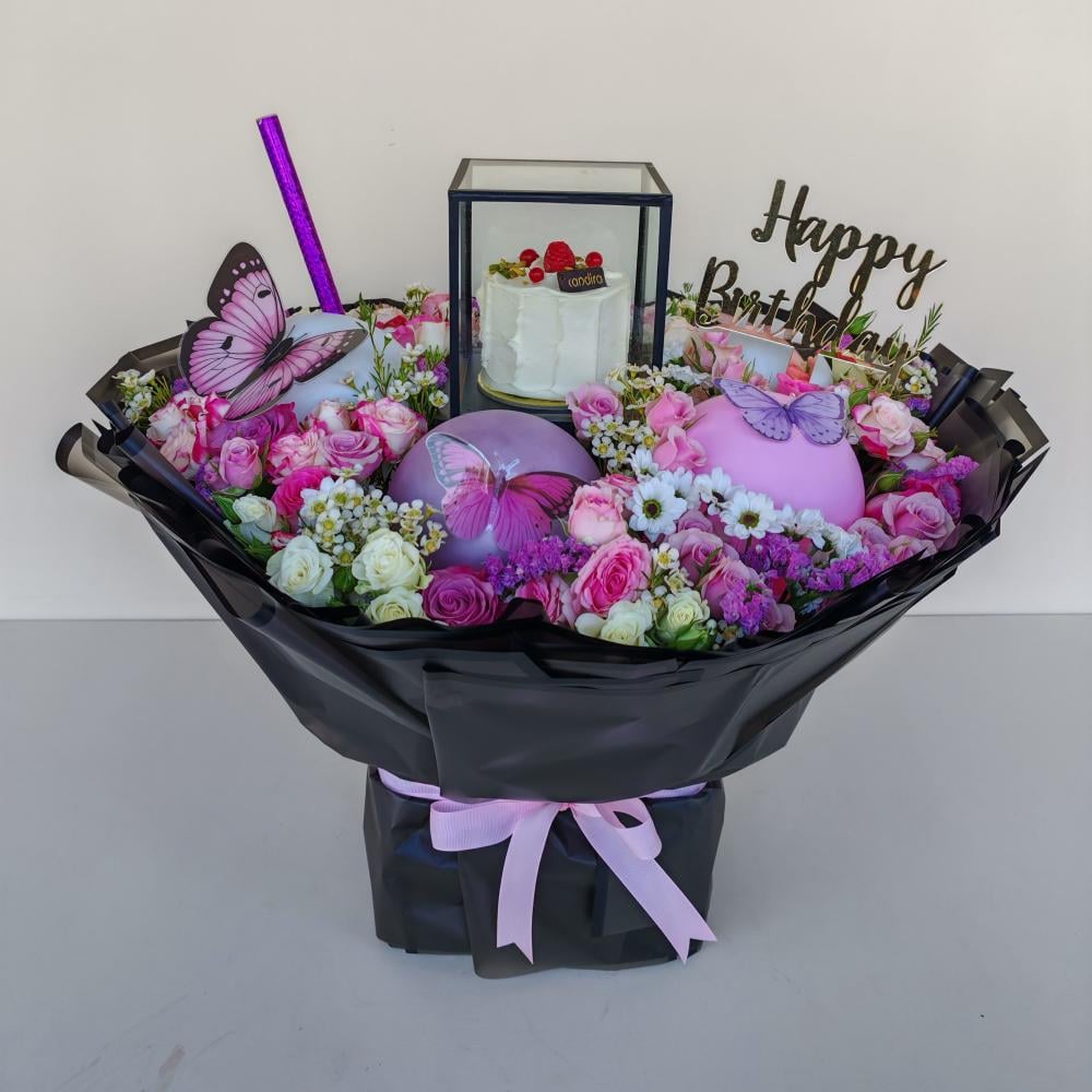بوكيه عيد ميلاد فاخر بتصميم أنثوي ناعم مستوحى من الفراشات. يضم مزيجًا رائعًا من الورد الوردي، الأبيض، البنفسجي، وزهور الواكس العطرية مع كيك كانديرا الفاخر في صندوق زجاجي أنيق، مزين بعبارة Happy Birthd...